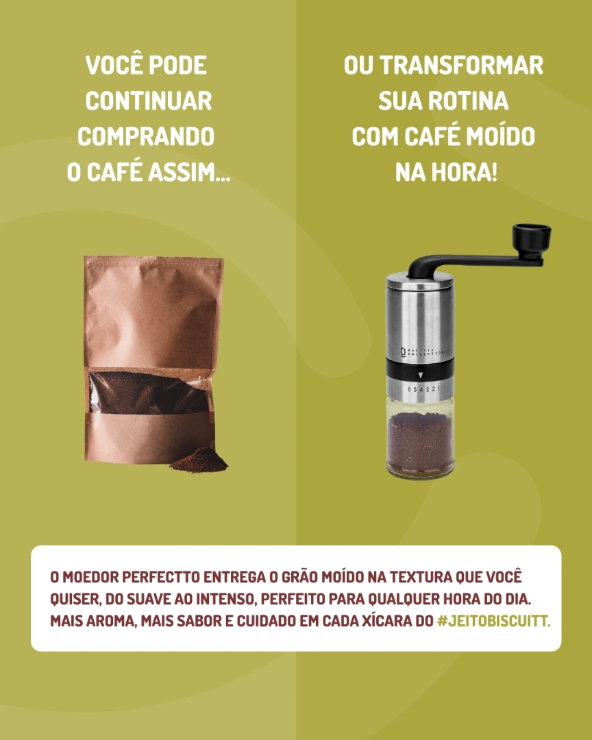 Descubra o prazer de moer seus próprios grãos com o Biscuitt Perfectto – o moedor ideal para quem leva café a sério.