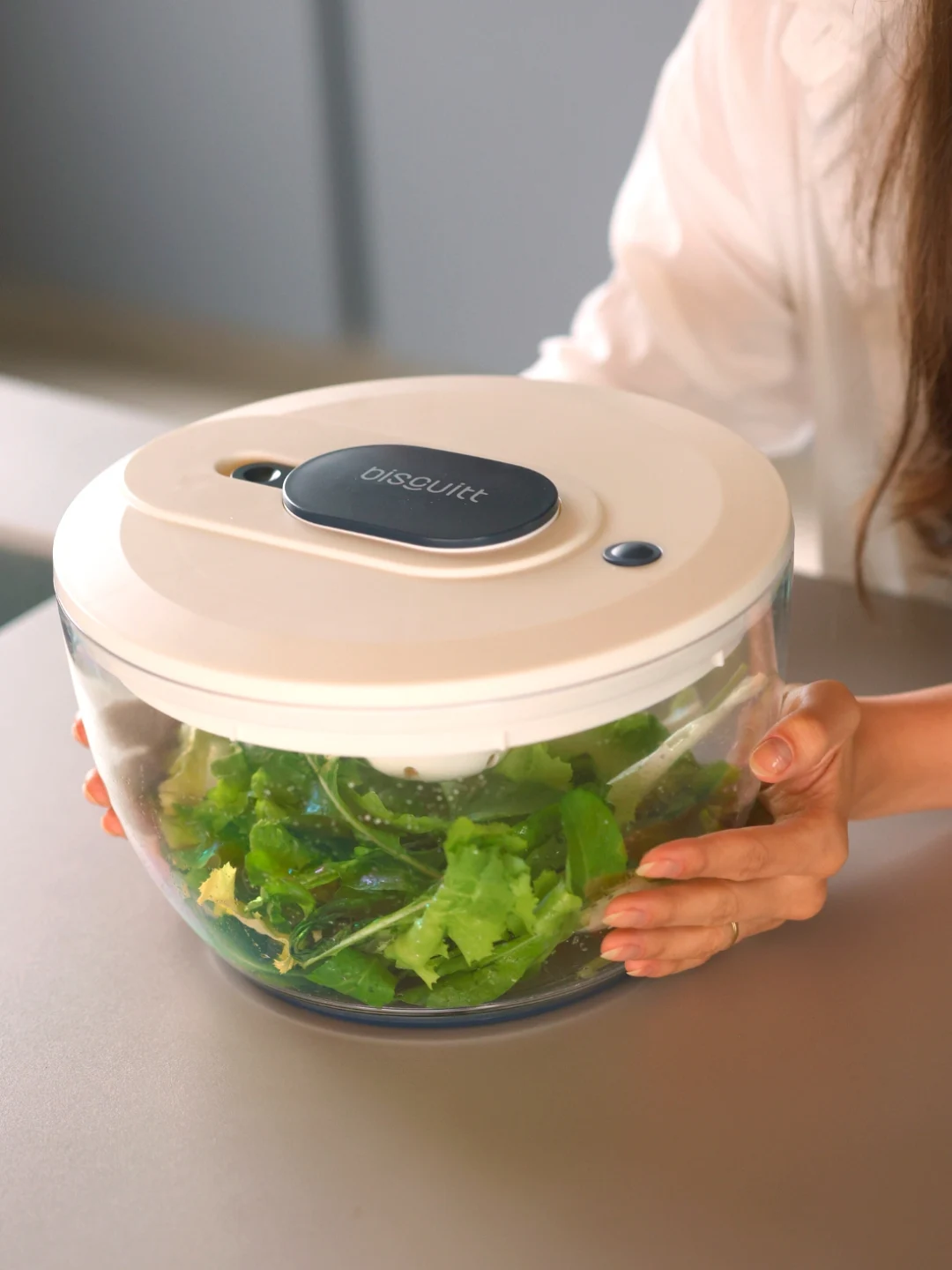 A cesta interna ampla funciona também como escorredor, permitindo lavar e secar as folhas no mesmo recipiente. A tigela externa, elegante e resistente, pode inclusive ser utilizada para servir à mesa, tornando o produto ainda mais versátil.